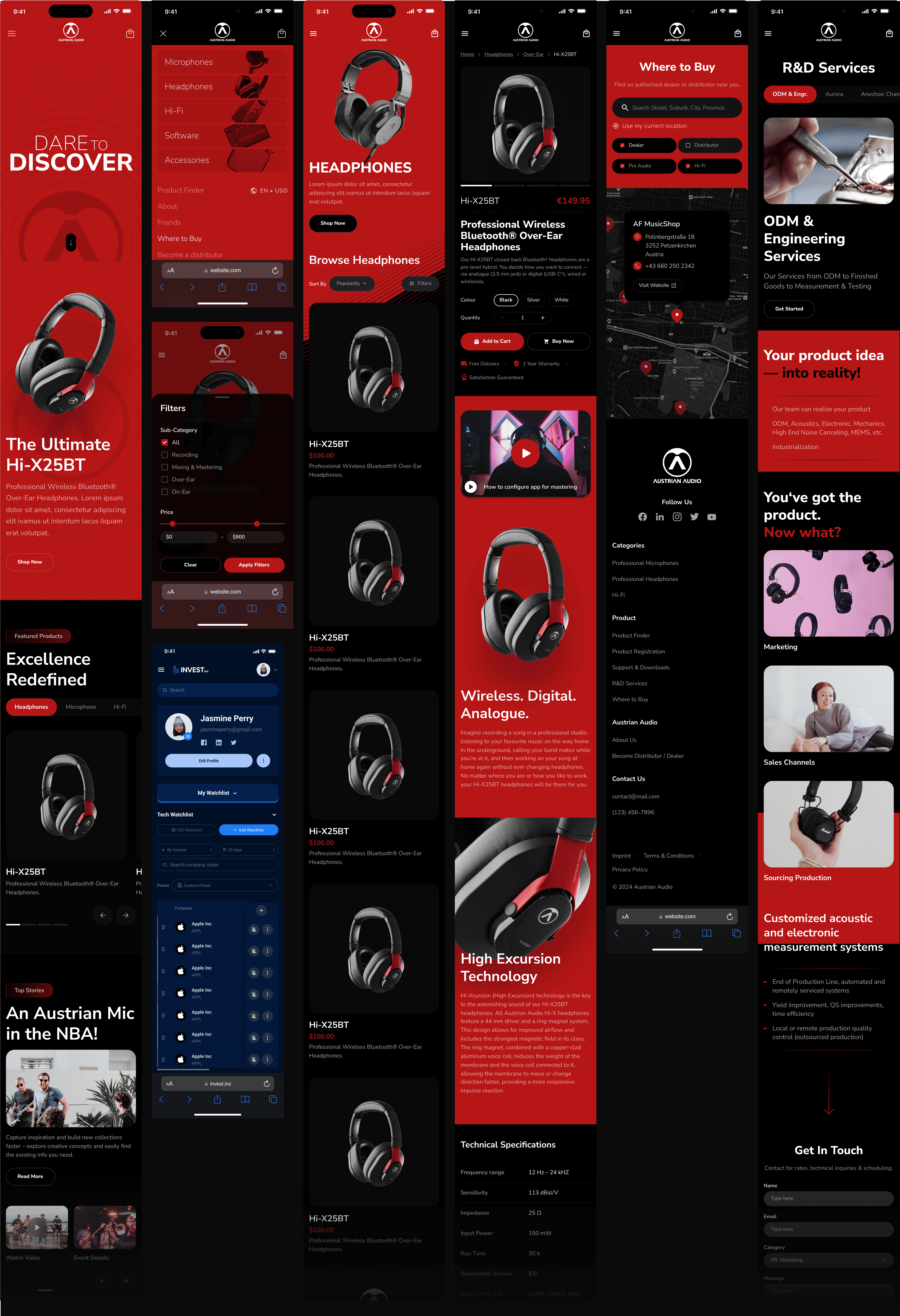 For the mobile experience, I concentrated on translating essential desktop capabilities into streamlined, intuitive flows tailored for touch interactions. The signature black and red color scheme, accentuated by pulsating sound wave motifs, maintains consistent Austrian Audio branding across devices. Layouts and fonts are optimized for effortless mobile scanning, with ample spacing between elements to enhance usability on smaller screens.