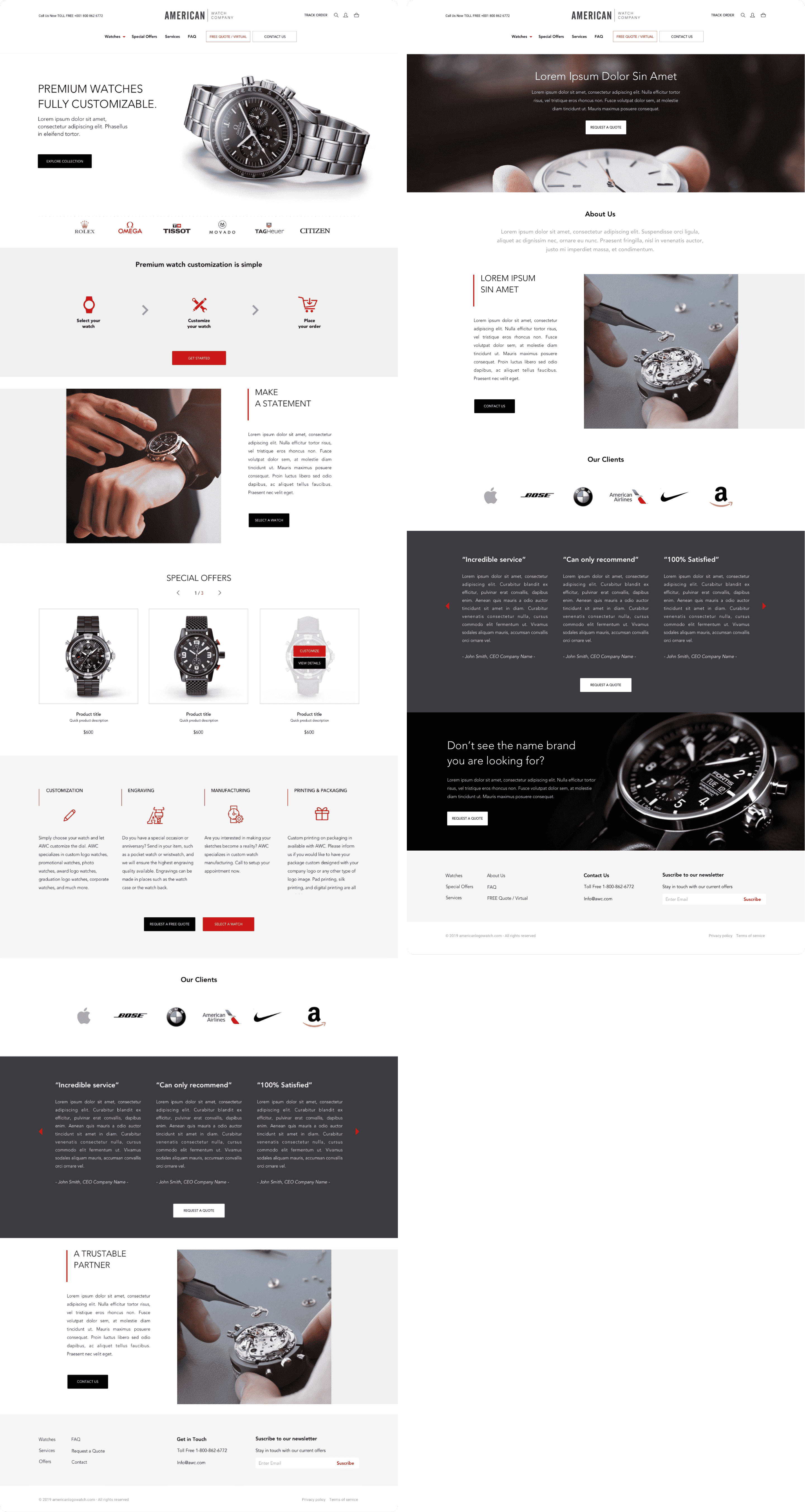 American Watch Company allows customers to completely customize high end watches. It is mostly targeted to businesses who want to engrave, add logos, customize colors, text, case and dial of a watch with the visual identity of their brand.