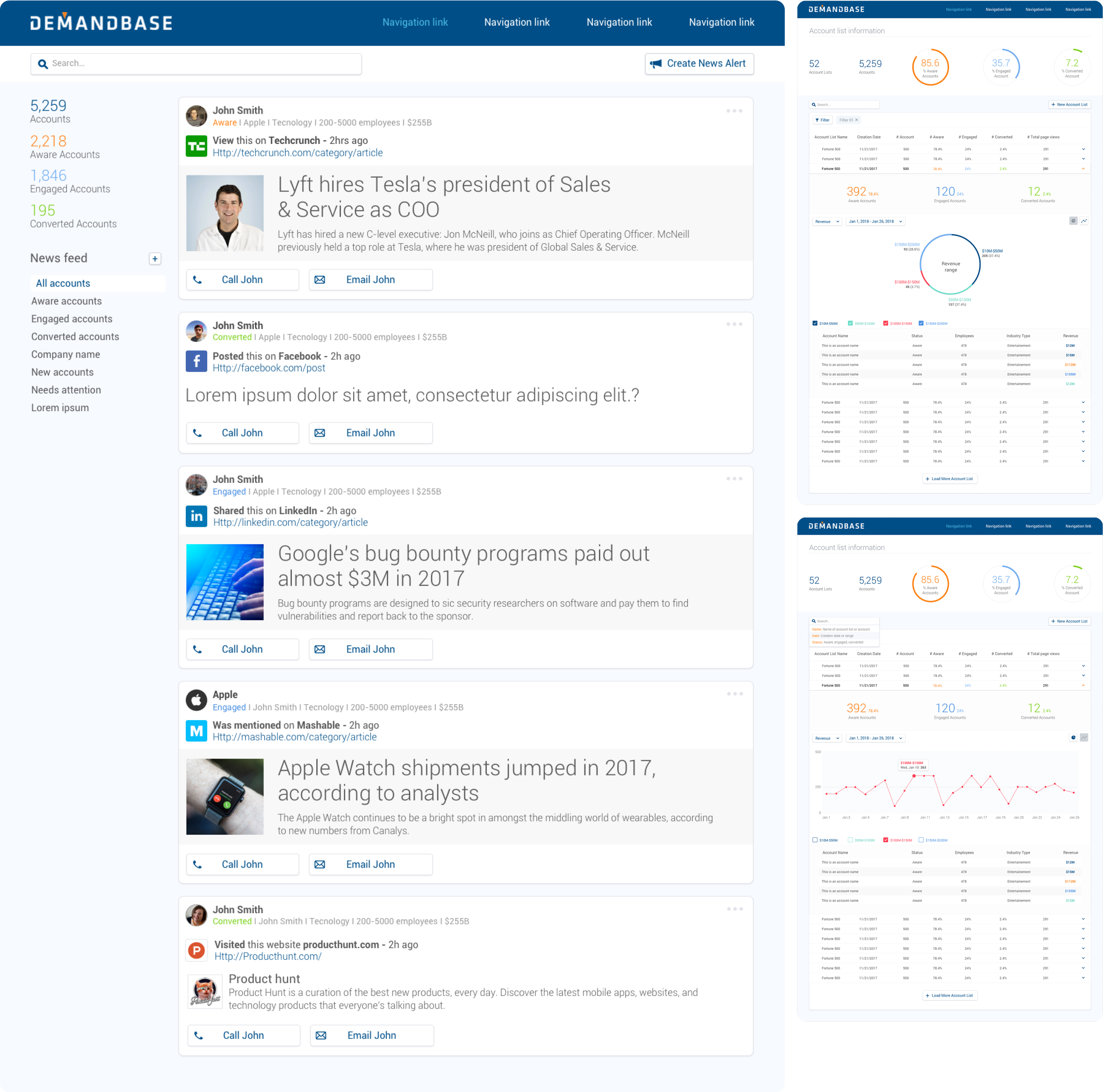 For a project like DemandBase, the design and aesthetic must serve the user experience at its maximum. There is no room for gimmicky UI components. The color scheme, shapes, tables, dropdowns and animations have all been studied to maximize the user comprehension and ease of use, resulting in a seamless and incredibly intuitive experience.