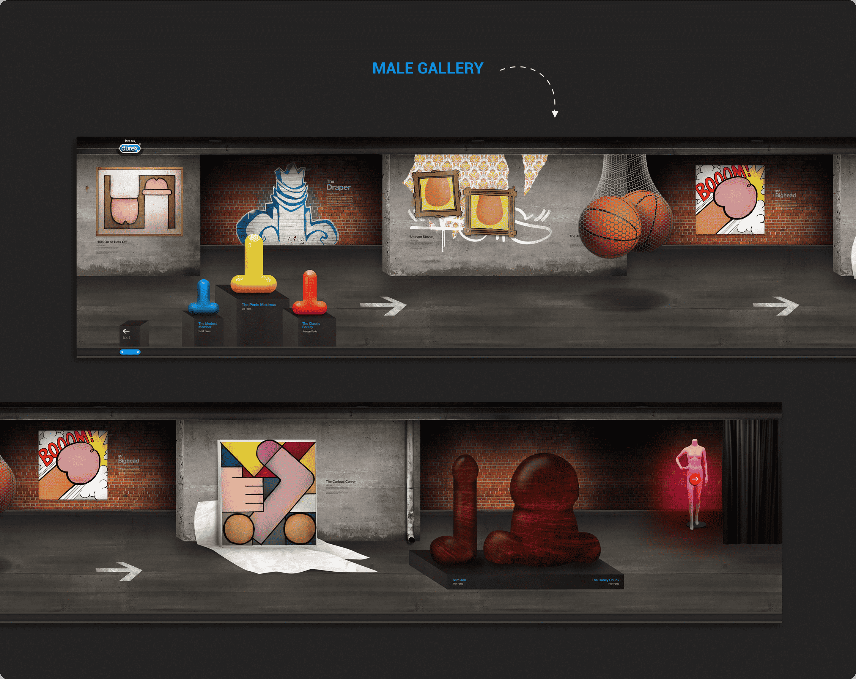 In an effort to educate young people about practicing safe sex, Durex wanted to launch a website where the youth could learn more about theirs and others' bodies in a fun and entertaining way. It led to the creation of a "Part gallery", an interactive art gallery where the users could browse around in a horizontal, scrollable website.
